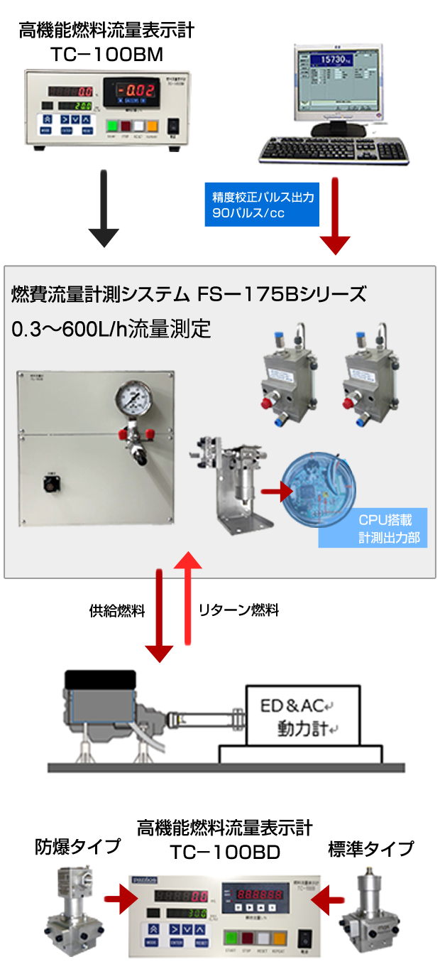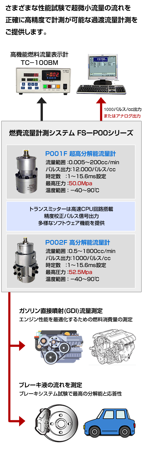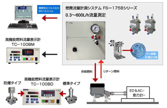 低排出ガス、低燃費自動車・産業機械の研究開発が活発化する中で、あらゆる計測環境に対応した精密な燃料流量計。トランジェントモード試験時の燃料流量の高速追従性、高分解能計測、燃料配管の影響や、ガソリン、軽油、アルコール類等、バイオ燃料等の燃料の多様化対応も求められています。また、ガソリン直接噴射(GDI)流量測定などのご要求に応えるウルトラ微小流量計(0.005~200cc/min、50MPa)などの燃料流量計システムを提供します。